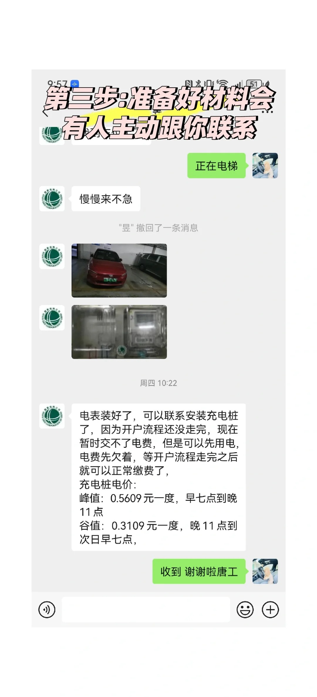 再然后:資料提交后有人會聯系你,見圖5,跟他溝通一下電表安裝的位置,如果不知道就找物業,(這時候就看物業的服務了)這個電表是免費的。最后:電表裝完聯系裝充電樁的人員上門安裝。(萬誠機電安裝電話:135-8166-9817)